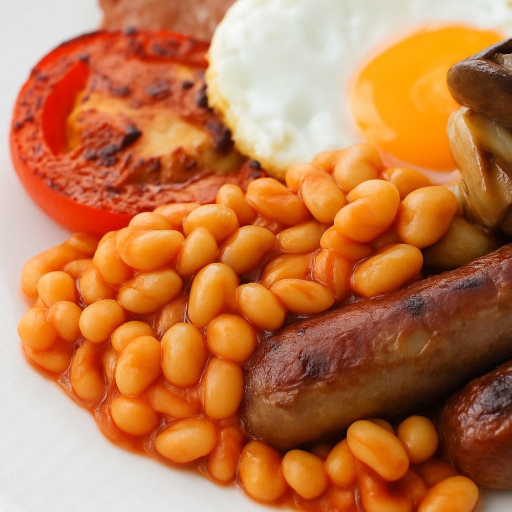 2 tostadas, 2 salchichas, baicon ingles, judias, tomate y 2 huevos fritos